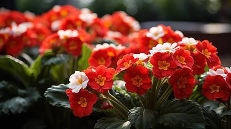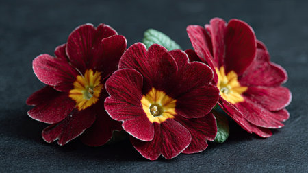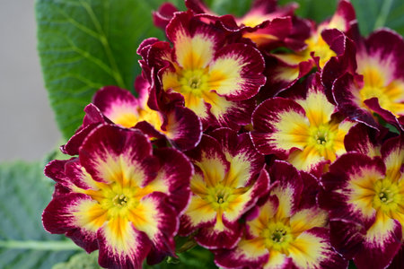 Macro shot of vibrant dark red primrose flowers with yellow centers, surrounded by lush green leaves, against a soft background