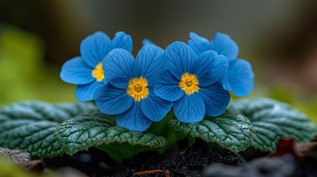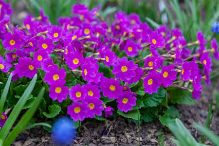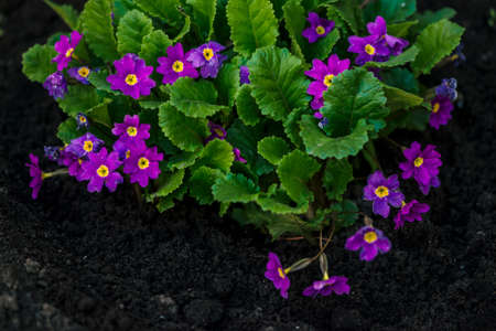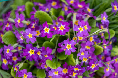 Beautiful violet flowers of primula with juicy green leaves grow in ground close up. Many small purple plants in macro. Background from group of little blooming primroses.