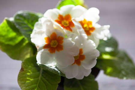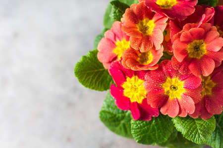 Orange primrose (Primula vulgaris hybrid) potted spring flower. Macro. Copy space. Selective focus
