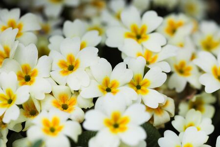 many beautiful primroses growing in the garden in the spring sunshine