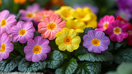 Close-up of vibrant primrose flowers showcasing various colors, adding beauty to a spring garden