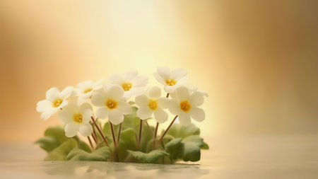 Generative AI : Spring forest primroses on a beautiful soft golden and purple background Macro Floral background