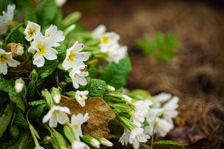 White primula flowers in shady spring forest closeup, Primula vulgaris flowering