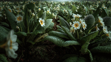 Vibrant white primroses with yellow centers, nestled among lush green leaves, stand out against a dark, moody backdrop.