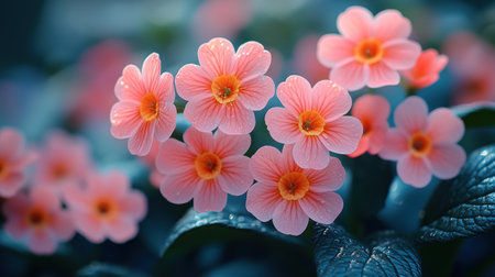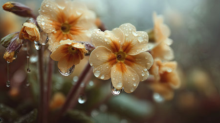 Soft rain falling gently on Polyanthus, with water droplets forming and slowly dripping. The background is softly blurred with a natural, moody atmosphere.