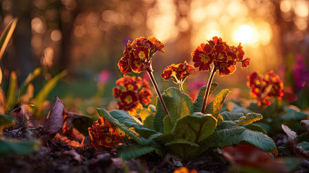 The Polyanthus at sunset, Golden red sunset light filters through the leaves, still atmosphere, warm orange glow blending with natural green tones.