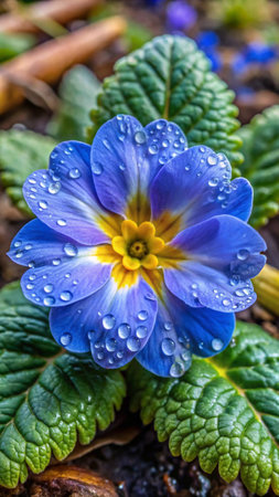 Beautiful blue primrose flower with drops of dew on it