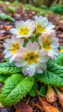 White and yellow primula flowers with dew drops in the spring forest