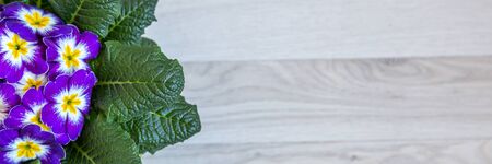 Flowers primula on a wooden table background