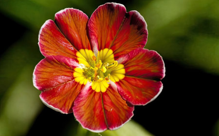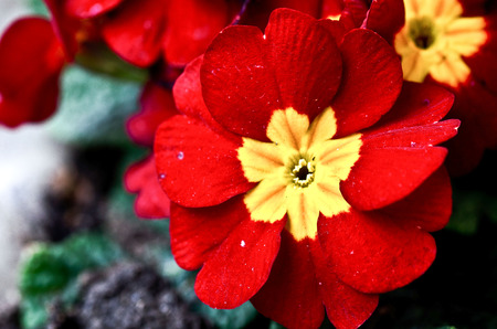 Closeup of wet flowers of primrose flowers, red and yellow