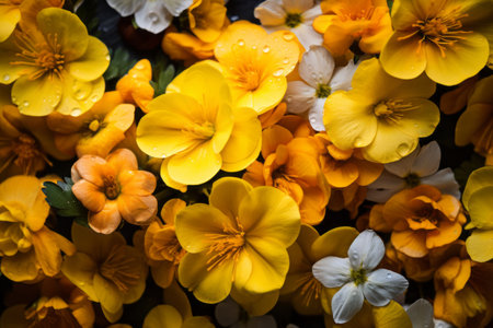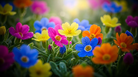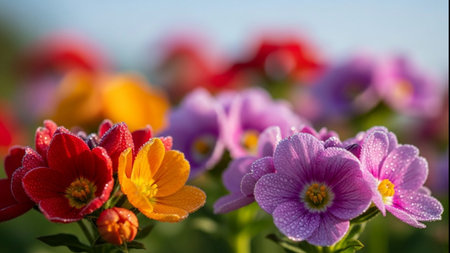 Close up of vibrant multi colored small flowers with water droplets on petals in soft sunlight, creating a cheerful and bright natural scene.