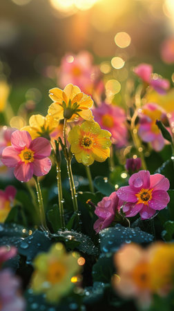 A close-up view of a garden in full bloom. Pink, yellow, and white flowers are in focus, with other flowers blurred in the background. The flowers are covered in morning dew, adding to their delicate beauty. The sunlight shines through the petals of the flowers, creating a warm and inviting atmosphere.