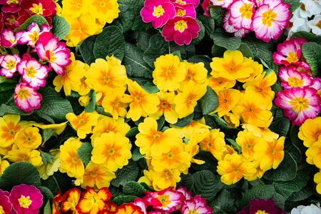 Multicolor primula is a marvellous addition to any garden. Colorful bright primrose flowers floral with green leaves background, Primula Vulgaris. use it as your Copy space, Design, Wallpaper and Poster, Selected focus.