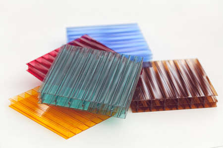 Lexan samples in different colors on a white background, note shallow depth of field