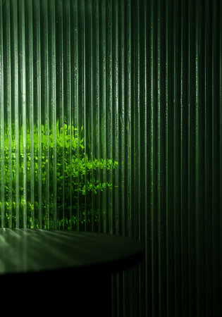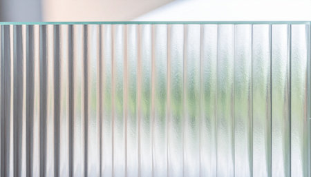 A sheet of modern fluted glass creates a serene barrier, diffusing the light and blurring the world behind it into a soft, abstract pattern.