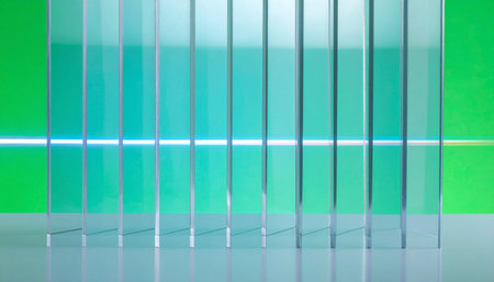 A series of sleek, transparent glass panes stand in perfect alignment, their cool surfaces catching the light against a vibrant green backdrop.