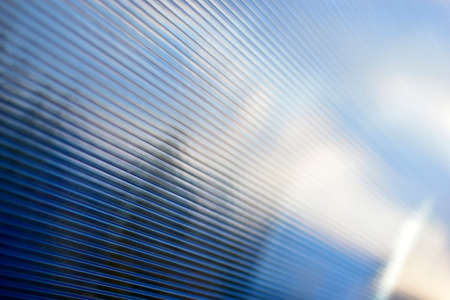 Blue surface of striped polycarbonate with a reflection of the blue distance of the city
