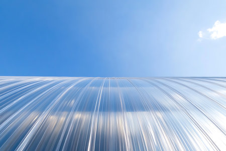 Detailed low angle view showcasing a clear plastic greenhouse with visible structure against a cloud-dotted blue sky, capturing light reflections.