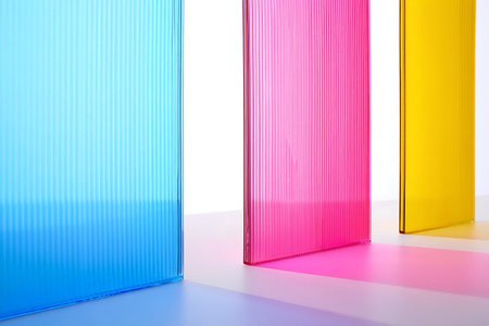 Three translucent corrugated panels in vibrant blue, pink, and yellow cast colorful shadows on a white surface.