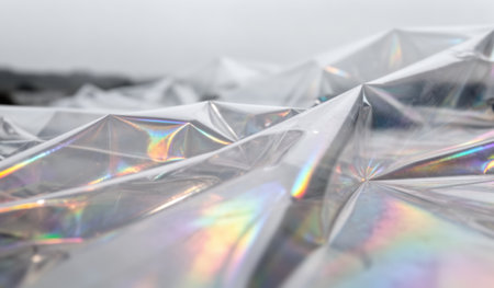Dewy droplets linger on a crumpled plastic sheet, capturing small rainbows as the dull sky reflects a still, serene mood. This quiet, gray day enhances the beauty of nature's patterns.