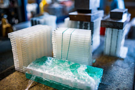 Stacks of transparent glass containers under press for TFT displays in assembling workshop of production plant extreme close view