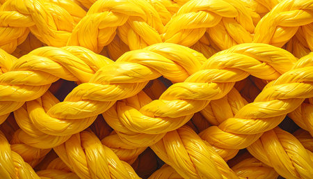 Macro shot revealing the detailed texture and interlocking pattern of thick yellow synthetic rope strands, highlighting its woven structure.