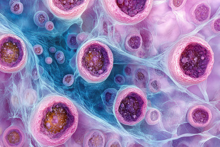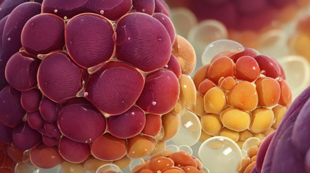 Vibrant close up of cell structures with intricate details showcasing biological activity and texture in a fascinating magnified view.