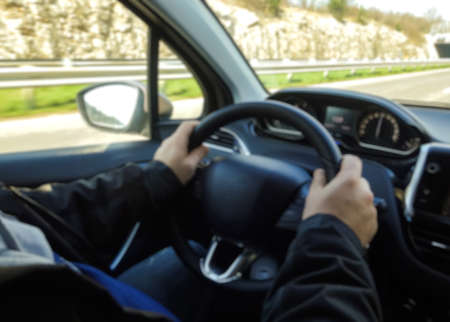 Abstract blur driving on road, view of driver messaging in car