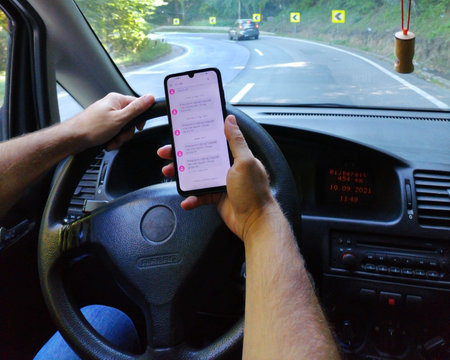 A man uses a mobile phone while driving a car. Another vehicle is on the road in front. Dangerous driving and a high possibility of a car accident