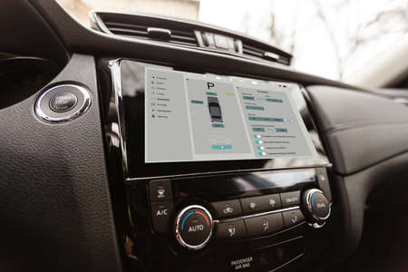 Modern car media display in the interior of the car. Touchscreen monitor on the dashboard of the modern car.
