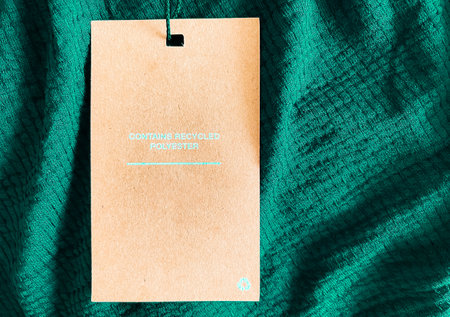 Contains recycled polyester fashion label tag, sale price card on luxury fabric background, shopping and retail concept