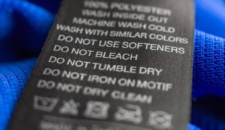 Black laundry care washing instructions clothes label on blue jersey polyester sport shirt