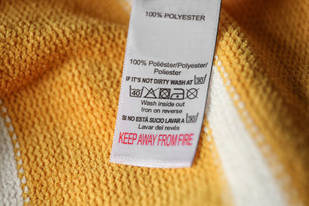 Clothing label with care symbols and material content on yellow shirt, closeup view
