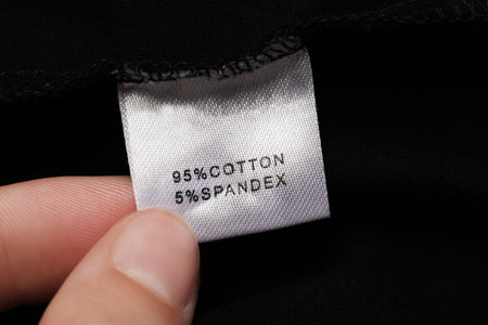Fabric composition clothes label closeup on black textile background