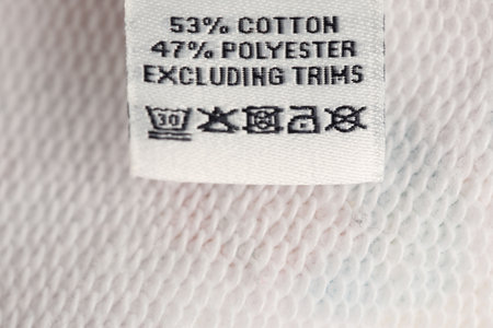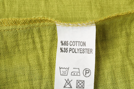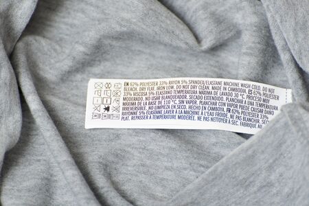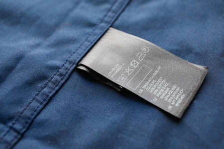 Clothing label with care symbols and material content on shirt, closeup view