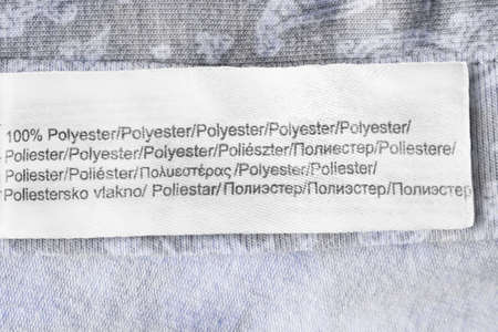 Clothing label says 100% polyester in various languages closeup