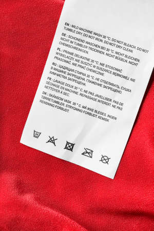 White laundry care washing instructions clothes label on red cotton shirt