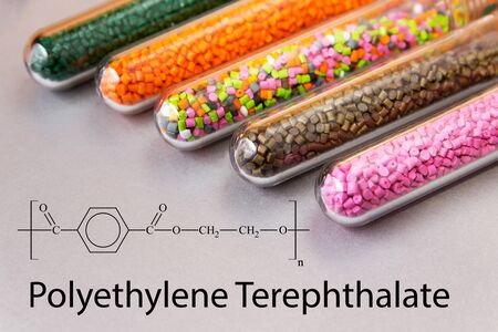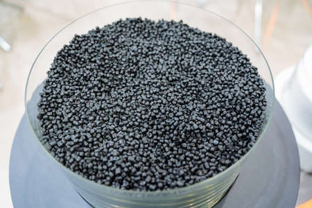 The grain of plastic granules lies in glass form, components of the chemical industry, small crumbs of PVC petroleum products, rubber particle filler. high quality photo