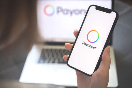 Kharkov, Ukraine - August 12, 2021: New Payoneer app. Woman using smartphone with payoneer banking application. Brand