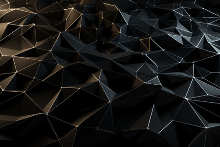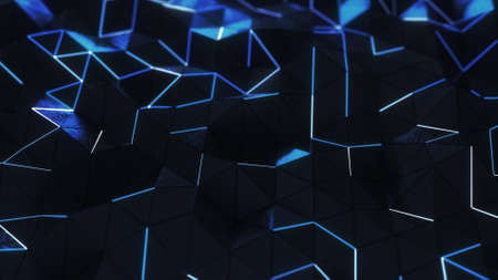 Polygonal black glossy surface with glowing blue lines. Abstract futuristic technology graphics. 3D render with DOF