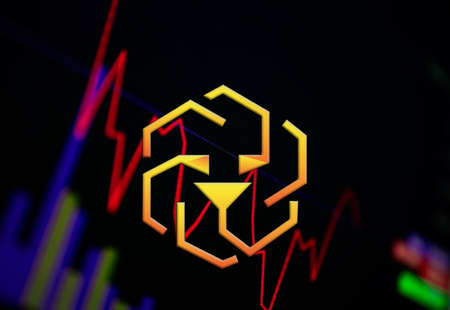 Polygon MATIC cryptocurrency logo on the screen of smartphone in mans hand with downtrend on the chart on a red light background, February 2022, San Francisco, USA.