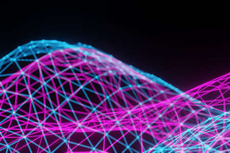 Abstract partially blurred background, polygonal grid of neon pink and blue colors on black background. Copy space. 3d render