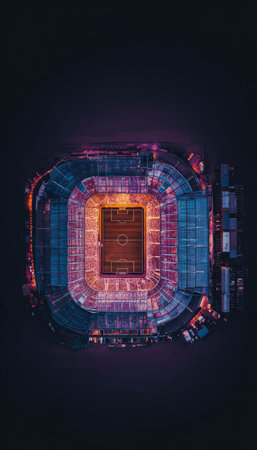 An overhead perspective reveals a modern stadium lit with vibrant colors during the evening. The composition showcases geometric forms and architectural details. The image could be suitable for promotional materials, architectural projects, or visual content requiring a dramatic, dynamic aesthetic.