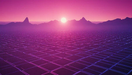 80s synthwave styled landscape, retrowave wireframe mountains, neon lines over arcade space planet canyon. Generative AI.