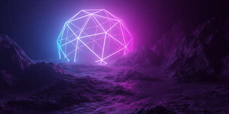Mountain terrain landscape with pink and blue neon light glowing triangle dome sphere wireframe frame, retro technology or futuristic alien background template, 3D illustration