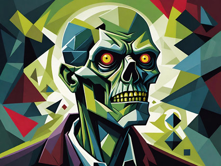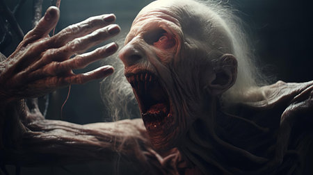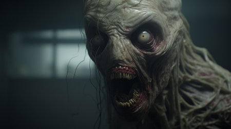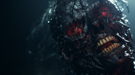 a zombie with big eyes and teeth is depicted in this hyper-realistic photo. the redshift effect adds a brutal action vibe, while the detailed anatomy showcases the artist's skill. the yankeecore theme is evident through the heavy impasto technique used, creating a close-up view that intensifies the eerie atmosphere. ai generated