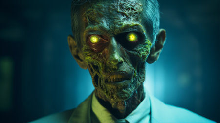 a zombie, with green eyes, walks in the darkness. the photo captures the essence of lens flare and hyper-realistic sculptures, enhanced by softbox lighting. the close-up shot showcases the intricate details of this suburban gothic, steampunk creature. this tabletop photography piece is a captivating blend of eerie and artistic elements. ai generated