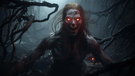 Terrifying 3d horror character crawling in a spooky forest