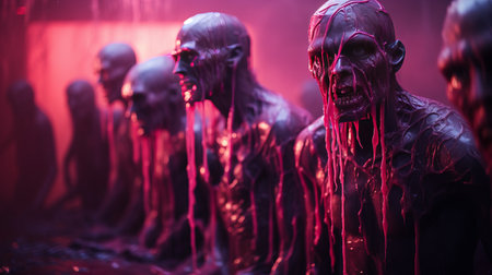 disgusting monsters in a weird photoshoot, captured in a hyper grainy blacklight setting. this industrial-themed punk art film still from a 1980s grindhouse movie depicts a dark and detailed scene in the night. it resembles a gritty panos cosmatos film about a necronomicon demon warrior, showcasing realism in 4k with an 8mm aesthetic. the intricate yet simple 1970s japanese horror claymation movie poster adds chromatic