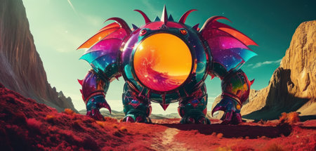 The side view of the colourful creature or monster that stay near to the colourful wall background in some sort of a bright light room that show a detail of the colourful creature or monster. AIGX03.